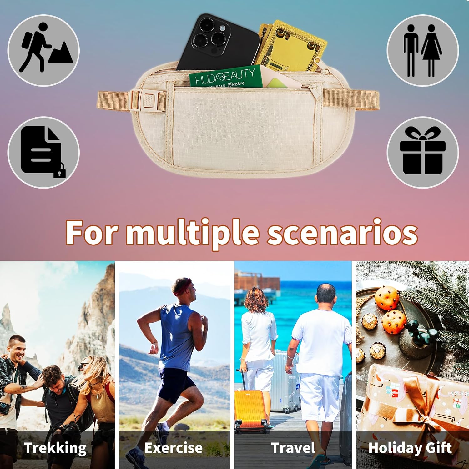 The money belt for travel is a secure solution to keep your ID card, credit cards, passport, cash, cell phone etc. Not just use in travel, but also in sports and other occasions, as running waist belt or fanny pack!